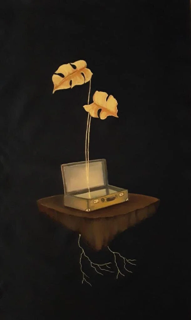 My sculptures and paintings are little familiar objects that weave stories. These small objects act as bearers of hope and bridges making the link between cultures. An empty chair symbolizes what we left behind and keeps us connected to our roots. A lonely boat is a bearer of hope. A floating bridge invites us to build connections and empathy towards the unknown.β Houda Terjuman
